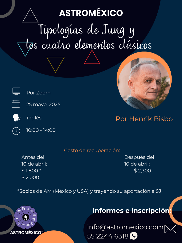 WEBMINAR DE ASTROLOGÍA TIPOLOGÍAS DE JUNG Y LOS CUATRO ELEMENTOS CLÁSICOS Por: Henrik Bisbo DATOS DEL CURSO VIRTUAL Plataforma: Zoom Fecha: Domingo 25 de mayo Idioma: Inglés Horario: 10:00 – 14:00 Costo de recuperación: Antes del 10 de abril Después de 10 de abril $ 1,800 * $ 2,300 $ 2,000 *Socios de AstroMéxico (México […]